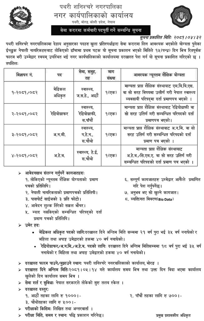 This notice is published to inform that Pathari Shanishchare Municipality requires to fill the following positions through open competition on a contractual basis. Interested and eligible Nepali citizens are invited to submit their applications in the prescribed format to the Office of the Municipal Executive within 15 (fifteen) days from the first publication date of this notice. Applicants must be present in person to submit the duly completed application form.